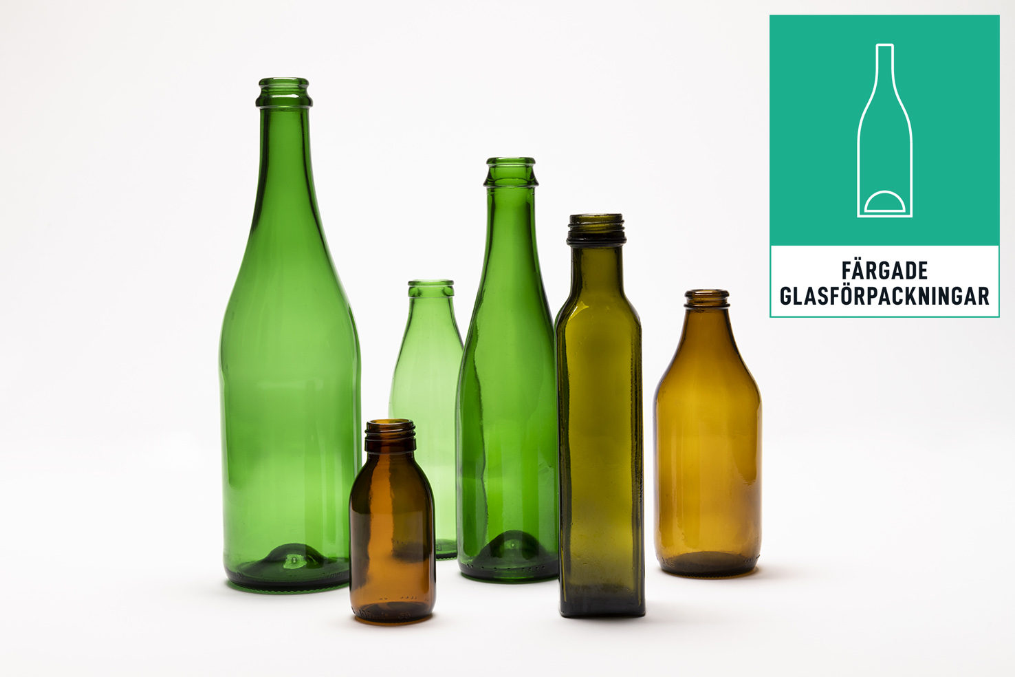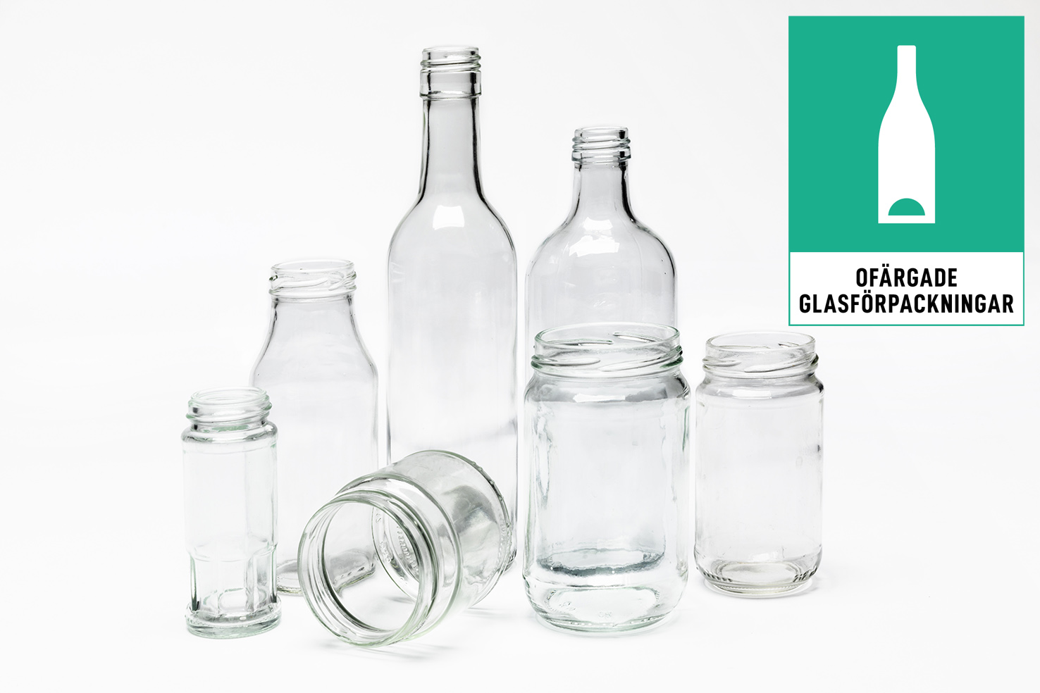 Flaskor och burkar i glas lämnas som glasförpackningar. Sortera och lämna färgade och ofärgade glasförpackningar var för sig.